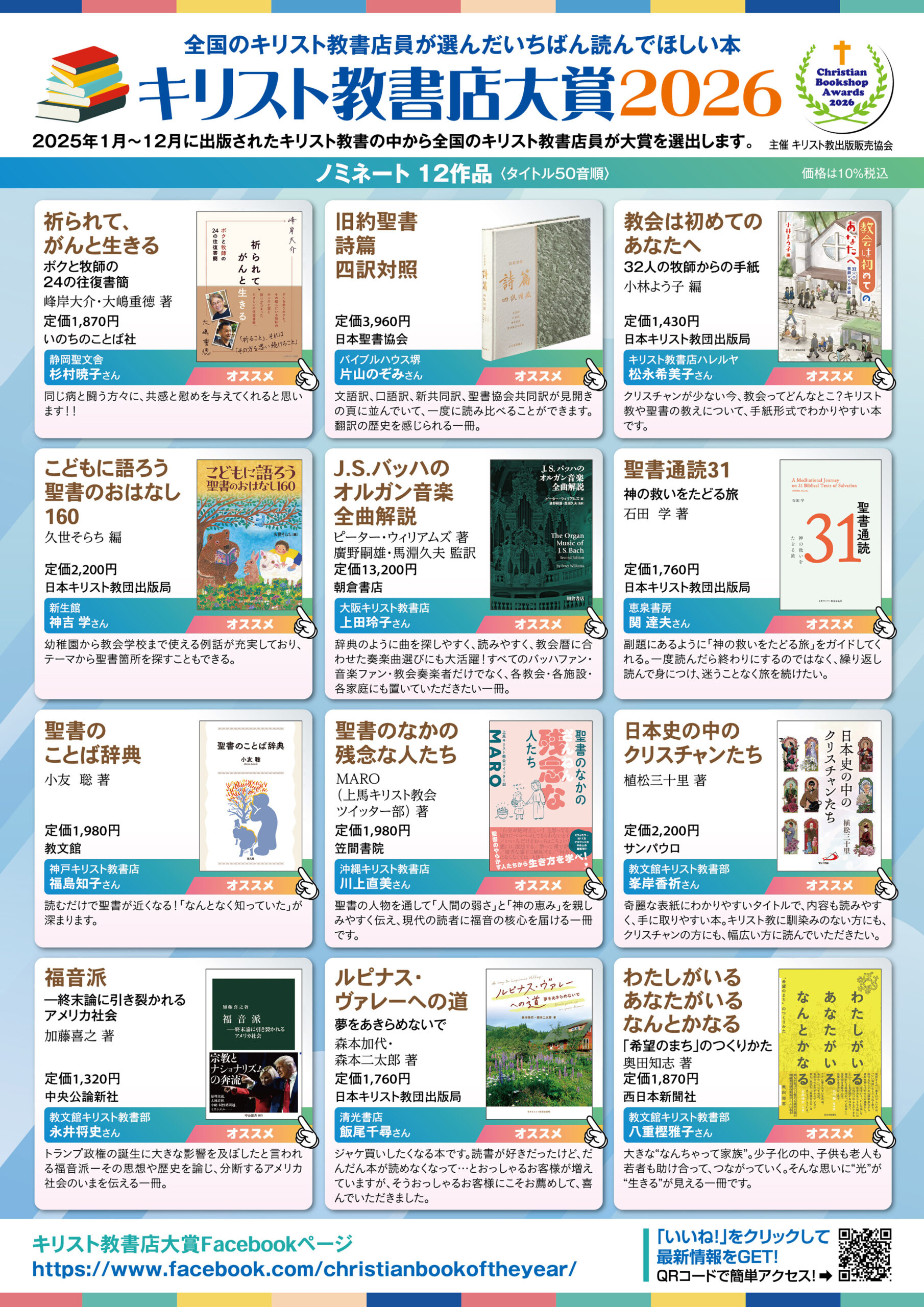 2026.04.30 キリスト教書店大賞2026 キリスト教書店大賞2026のノミネート12作品が出揃いました。 本年は同率順位の作品が生じたため、12作品の選出となっています。 この中から今年の大賞が選ばれます。 大賞発表は2026年8月上旬を予定しています。 https://www.facebook.com/christianbookoftheyear 記事のタイトルとURLをコピーする Post Share Line これから出る本 2026年4月 (2) 前の記事 新着のお知らせ 2026.04.29 これから出る本 2026年4月 (2) 2026.04.26 キリスト教書店が伺います! 2026.04.24 これから出る本 2026年4月