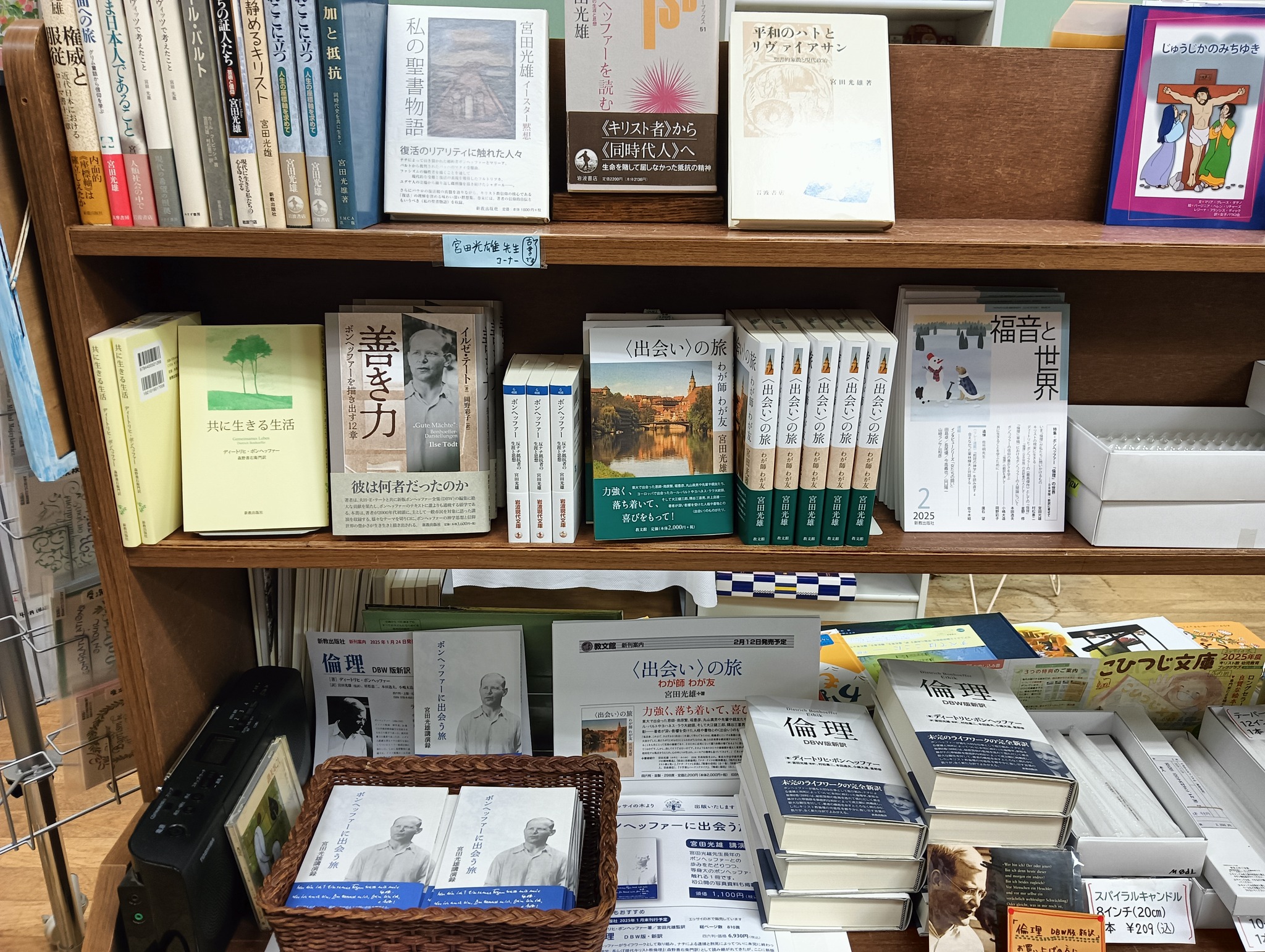 ボンヘッファーの本が出揃ったところで、フェア棚を準備いたしました。一番上は宮田先生著作の古書になります。