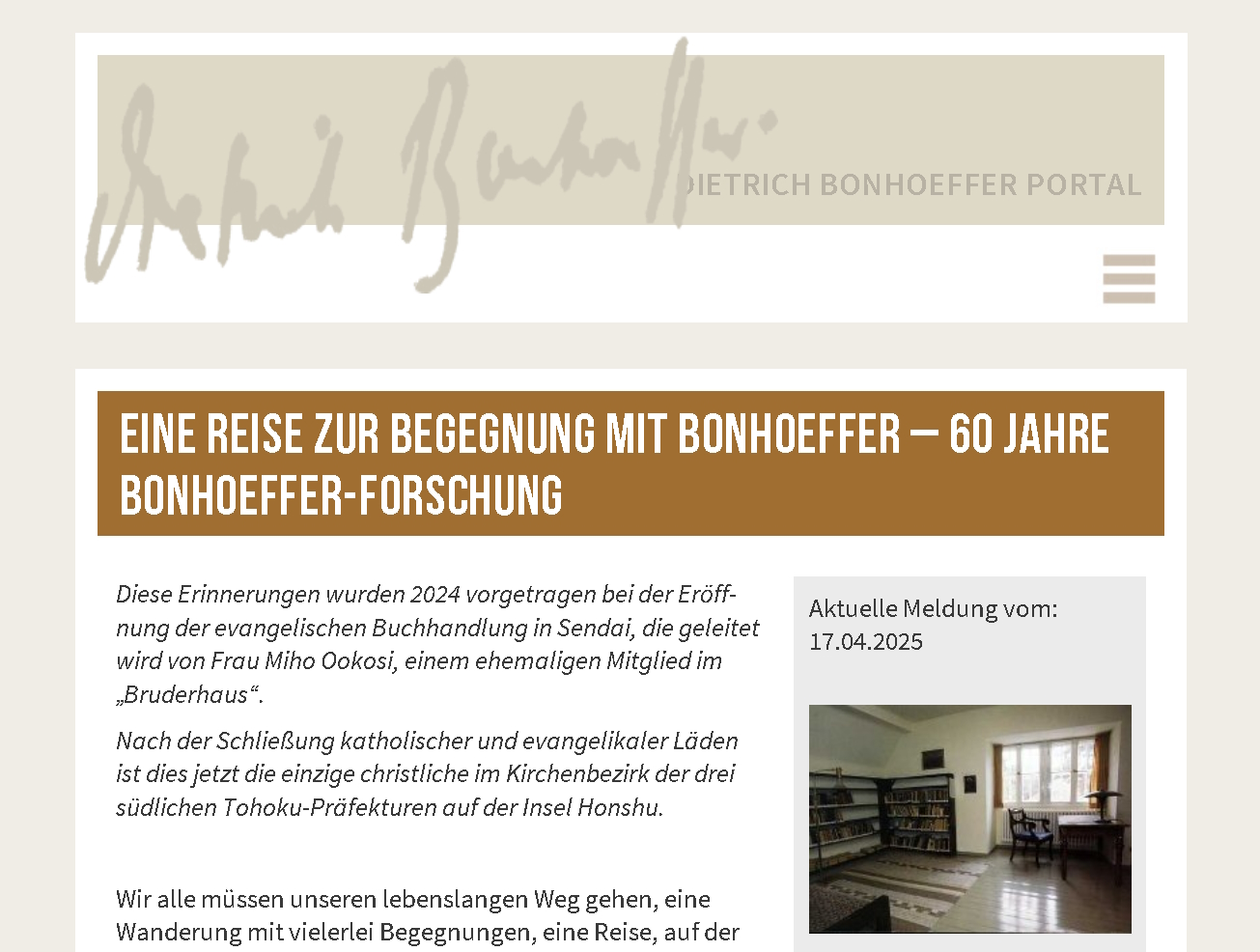 国際ボンヘッファー協会のニュースレターに宮田光雄先生の講演「ボンヘッファーに出会う旅」のドイツ語訳が掲載されました。