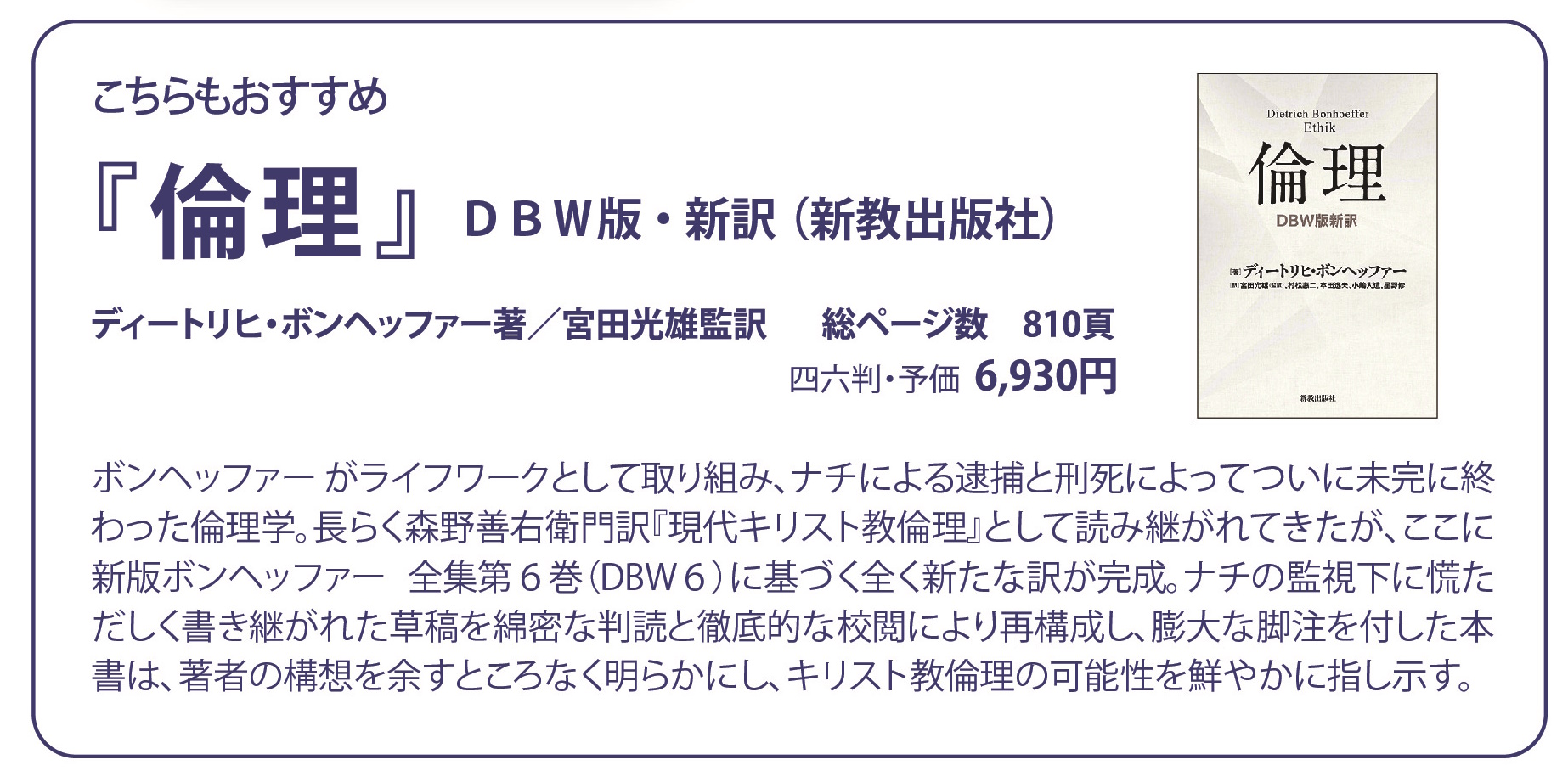 哲学・思想・倫理・社会書籍神学・教理 ボンヘッファーに出会う旅 ¥1100 (税込) 在庫あり 数量 ボンヘッファーに出会う旅個 お買い物カゴに追加 お気に入りに追加お気に入りに追加済み レビュー 以前にこの商品を購入したことのあるログイン済みのユーザーのみレビューを残すことができます。 ボンヘッファー 宮田光雄講演録『ボンヘッファーに出会う旅』 60年に及ぶ著者のボンヘッファー研究の道程を回顧し、ボンヘッファーの今日的な意義に説き及ぶ。 また付論「ポリフォニーとしての生――ボンヘッファーにおける愛の構造」と初公開の写真資料も収録。 宮田光雄先生長年のボンへッファーとの歩みをたどり つつ、等身大のボンヘッファーに触れる1冊です。 こちらもご覧ください 書籍 善き力 ボンヘッファーを描き出す12章 ¥3960 (税込) 注目! 書籍 倫理 DBW版新訳 ¥6930 (税込) 雑誌 福音と世界 2025年2月号 ¥660 (税込) 関連商品 書籍 始まりのことば ¥990 (税込) 書籍 アウグスティヌス神学著作集<キリスト教古典叢書> ¥7480 (税込) 書籍 聖人崇拝 ¥1980 (税込) 書籍 エラスムス神学著作集<キリスト教古典叢書> ¥7480 (税込) 書籍 モーセ(原田陽子) ¥2750 (税込) 書籍 アウグスティヌス著作集19-Ⅰ ¥8250 (税込) 書籍 パンセ<キリスト教古典叢書> ¥5720 (税込) 書籍 詩篇の思想と信仰Ⅳ ¥3850 (税込) 書籍 黙示文学の世界 ¥2530 (税込) 書籍 アウグスティヌス著作集16 ¥4180 (税込) 書籍 傷によって共に生きる|弱くてやさしい牧師の説教集 ¥1430 (税込) 書籍 ユーオーディア(松浦忠孝写真集) ¥2750 (税込) 最近チェックした商品 注目! 書籍 川田文子さんのこと ¥1100 (税込)