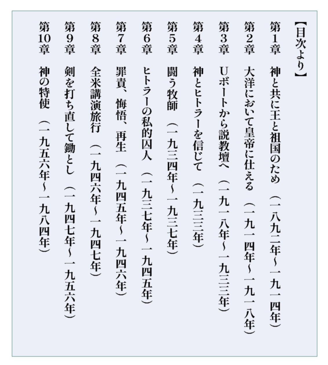 Uボートの艦長から愛国主義的な牧師へ、ナチ党支持者から強制収容所の囚人へ、教会改革の指導者から平和運動の旗手へ、その激動の生涯!「はじめに彼らは共産党員に向かってきたが、私は声を上げなかった――共産党員ではなかったから。つぎに彼らは労働組合員に向かってきたが、私は声を上げなかった――労働組合員ではなかったから。それから彼らはユダヤ人に向かってきたが、私は声を上げなかった――ユダヤ人ではなかったから。そして彼らが私に向かってきたとき、私のために声を上げてくれる人はひとりも残っていなかった」この有名な言葉を残したニーメラーは、最初からリベラルな平和主義者なのではなかった。アメリカの気鋭の歴史家が、保守的な思想の持主であったニーメラーがいかにして自己変革を遂げていったかを、聖人視を排して史的・批判的に辿った最新の評伝。