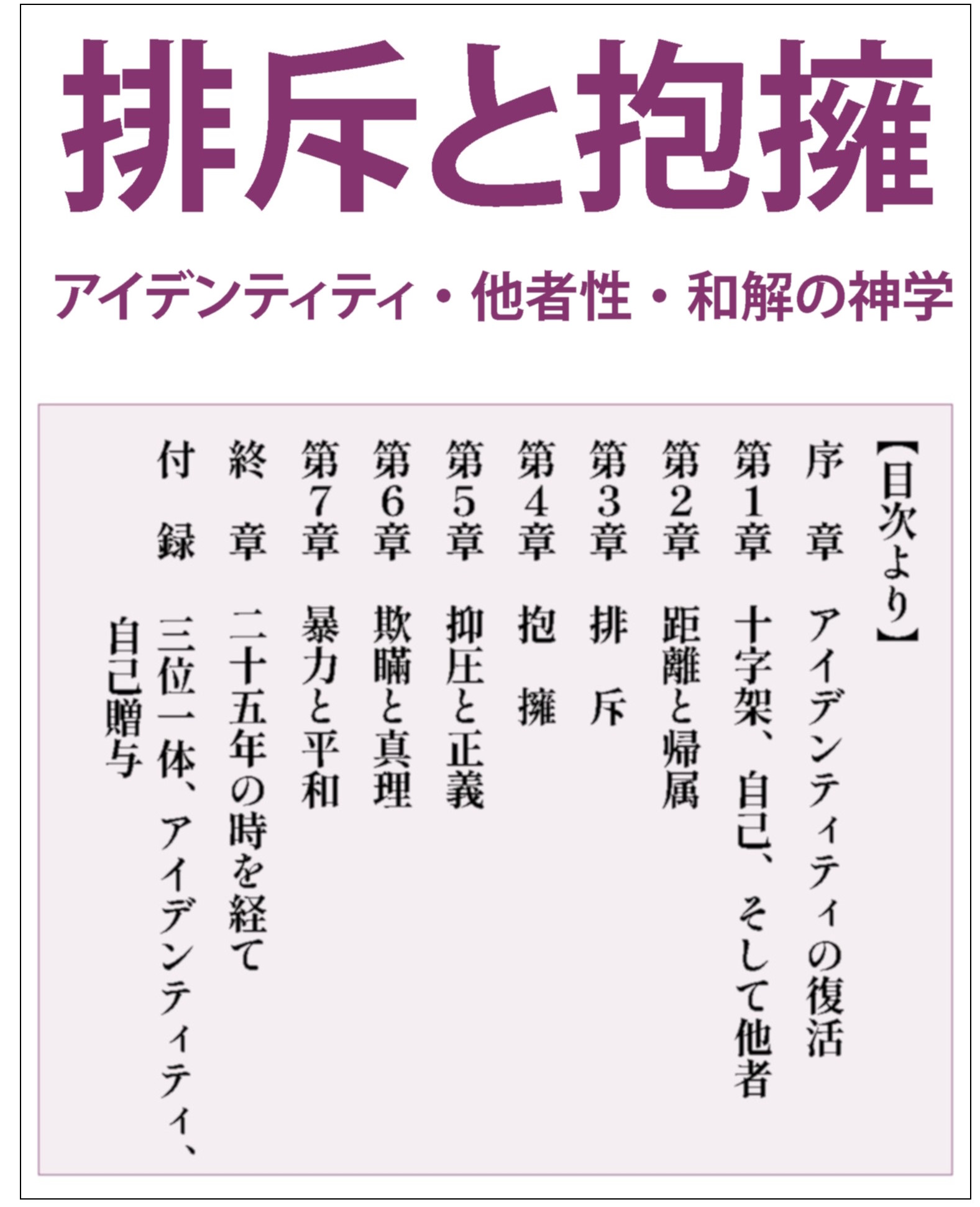暴力が猛威を振るう現代世界の中で和解の道はあるのか。凄惨な旧ユーゴ内戦を経験した著者は、罪と赦しの問題を、幅広い論客と対話しつつ十字架の神学に基づいて徹底的に考え抜く。著者は本書を自らの知的葛藤の記録であると同時に霊的旅路の記録とも呼ぶ。